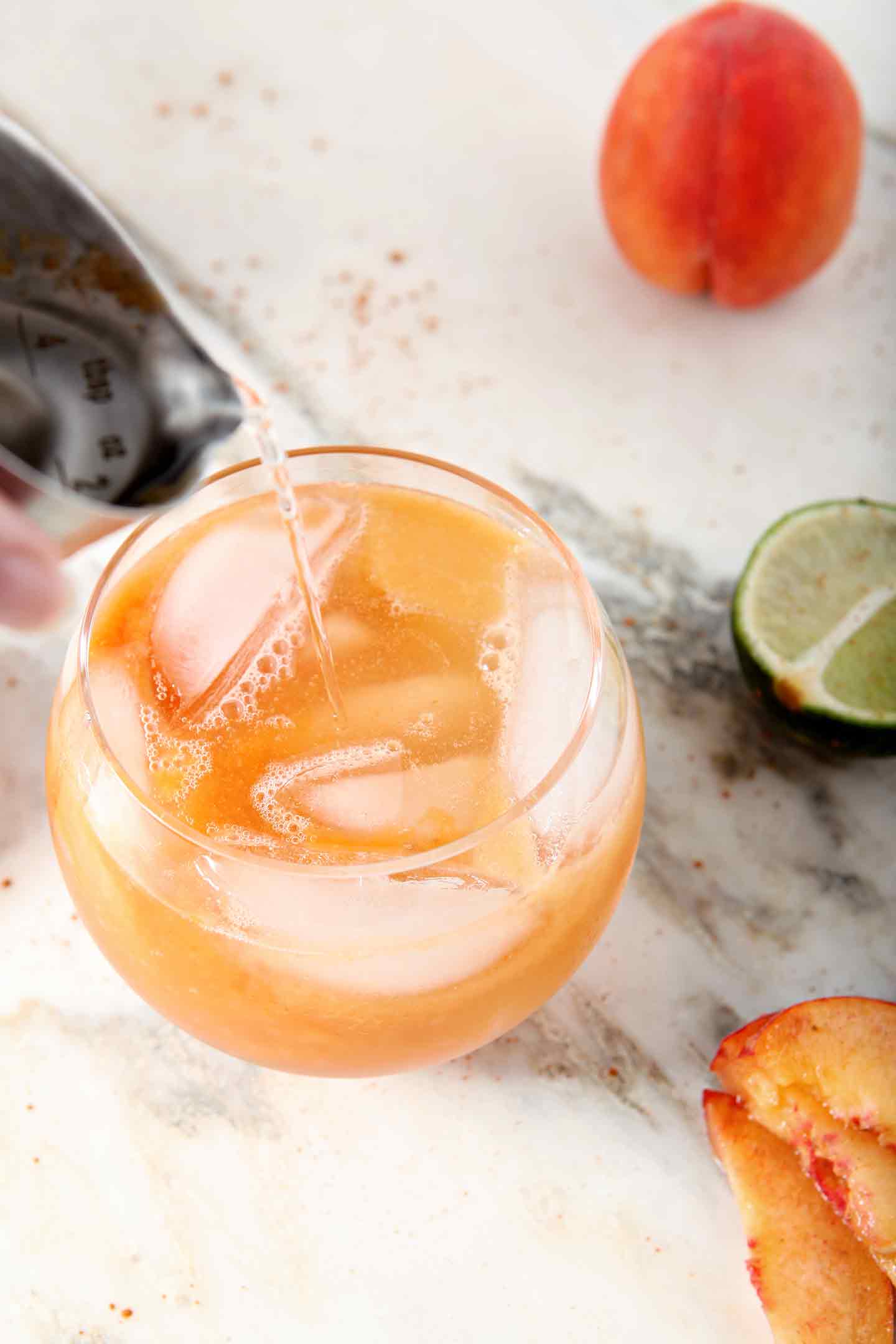 Puree the peach in a blender (or using an immersion blender). I like to blend the peach instead of muddling it with a muddler in my glass.